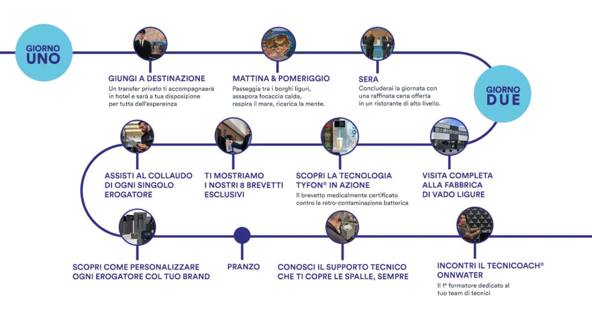 In due giorni ti mostriamo dal vivo la produzione Onnwater, la tecnologia TYFON, gli 8 brevetti esclusivi e il nostro supporto tecnico reale.
